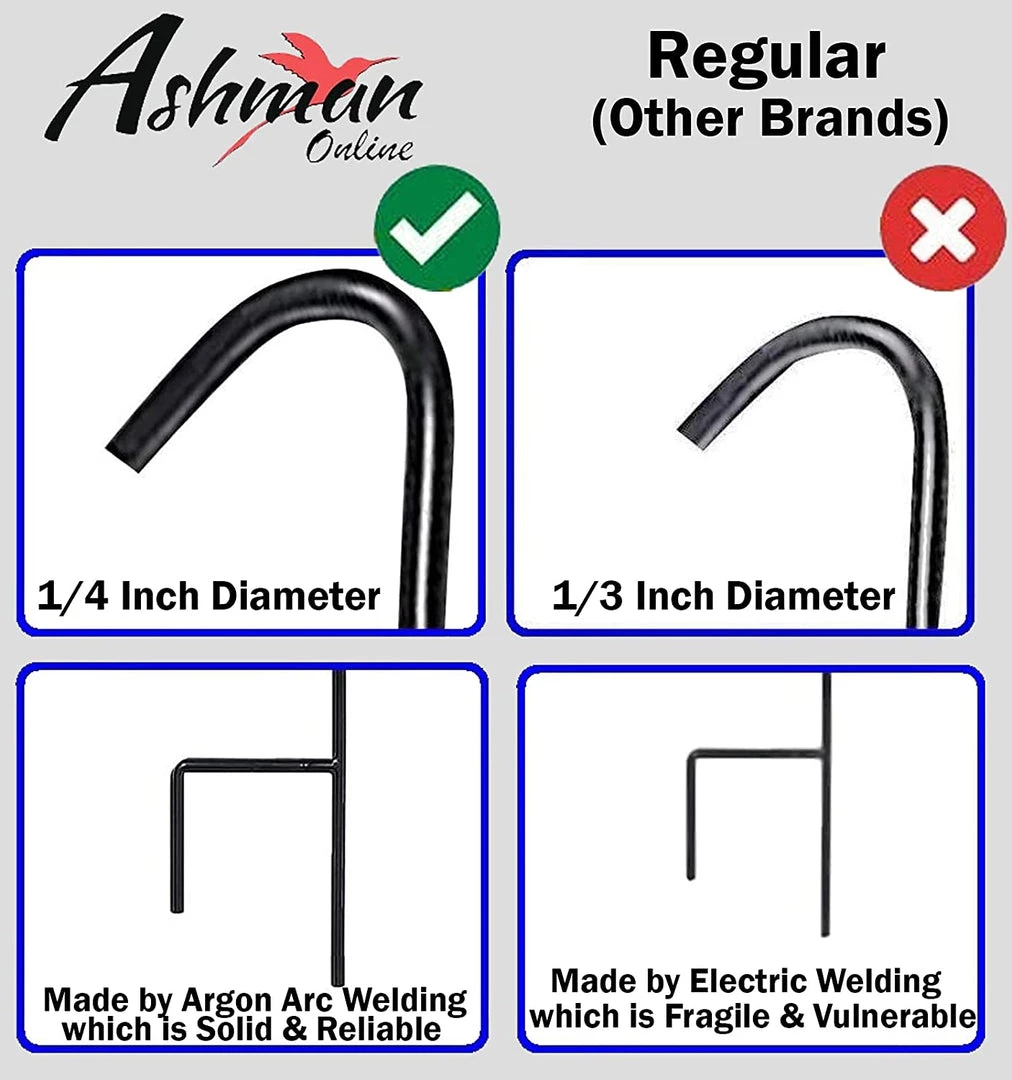 - EASE OF USE – Easy to set up and there are no plastics or complex assembly involved, You will not have to screw pieces together to make this hook and simply push the shepards hook in the ground with your foot and you are ready to go. Ashman Shepherd hooks garden stakes can be used year after year as the glossy powder coat finish prevents from rust and the black color remains lovely. Stake the items directly into the ground and begin enjoying them immediately.