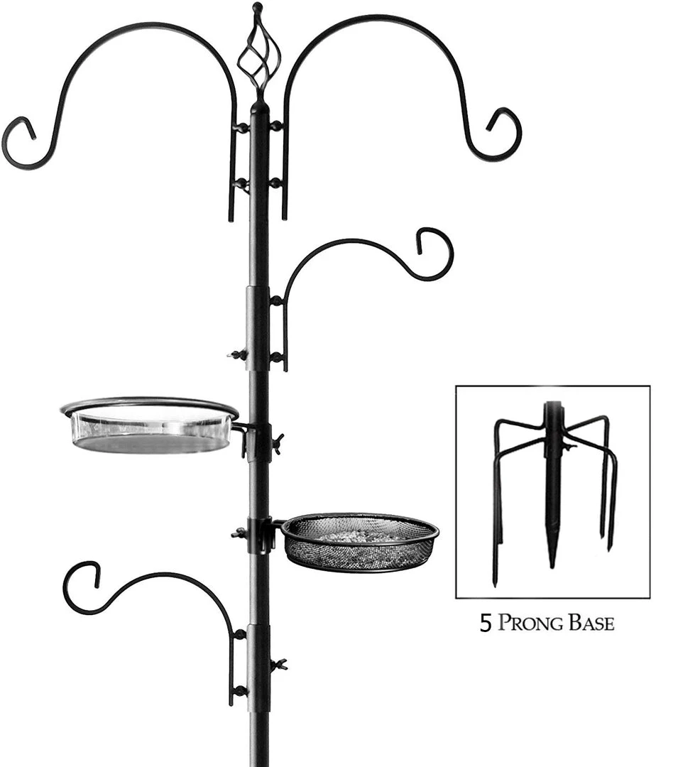 - ACCESSORIES:Β The bird station comes with heavy-duty twin top hooks, two small arms, a mesh tray, bird bath, and five prongs legs to insert it into the ground for additional stability. The top hooks can hold heavier bird feeders for several weeks of supply and the smaller hooks are especially good for humming bird feeders to hold nectar. All accessories are easily detachable for cleaning.