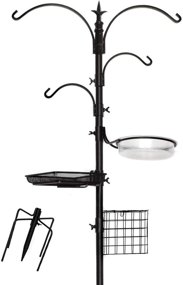- HIGH-QUALITY PREMIUM DESIGN β The unique design helps with flexibility, as the Bird Bath Tray, Mesh Tray, and Suet Cage Tray can be placed at any height as per the requirement. This helps choose the optimum height thatβs suits the specific needs of the surrounding environment. The 5 pronged support ensures that the station has adhered firmly into the ground with stability.
